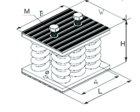 說明: JS-6型組合式阻尼鋼彈簧減振器是由多重組合彈簧組成、上下鋼板及鋼板外表粘貼阻尼橡膠防滑墊組成。該產品為開敞式結構,具有靈活性大、穩定性好、固有頻率低、減振效果顯著等優點,安裝時可直接安放在設備底下,若動力設備撓力較大,可先調節重心,並將減振器底座固定孔用螺栓固定地基。